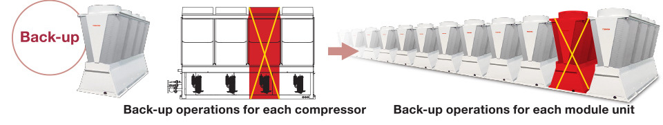 System reliability is also a major consideration of client. The modular design of the chiller can avoid risk of system shut down or sharp capacity decrease at the time of unit trouble or maintenance work. Furthermore, capacity redundancy is maximized because each chiller module has four independent refrigerant circuits. This allows back-up operations for each module unit.